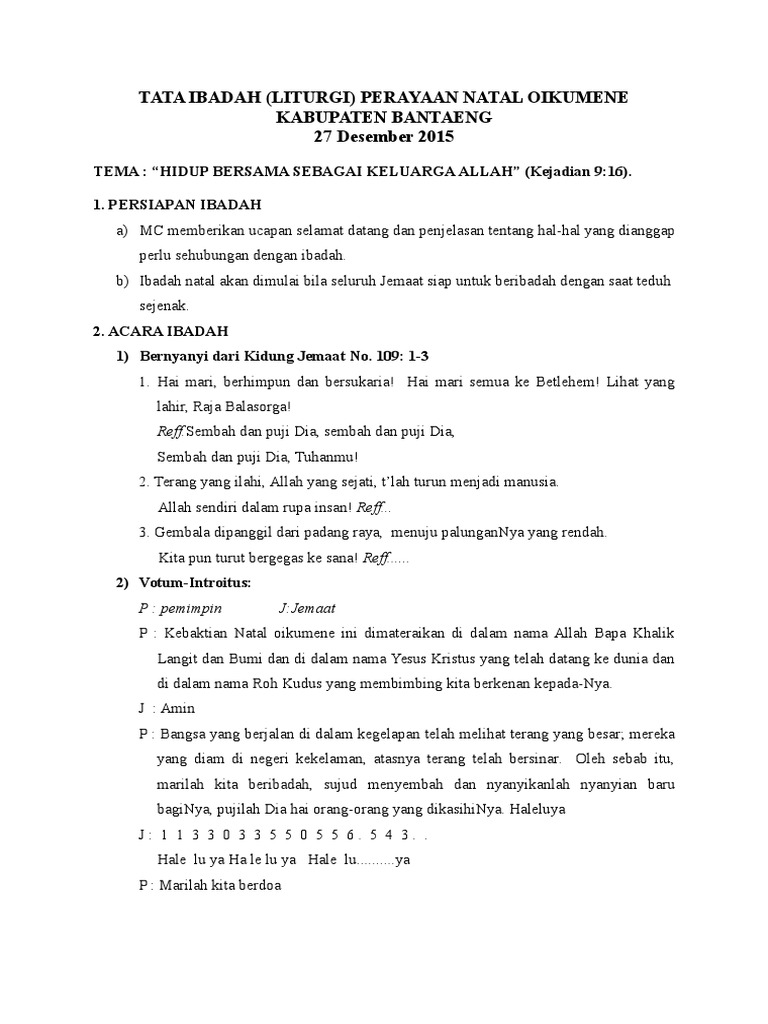 Tata Ibadah Natal Omk from imgv2-1-f.scribdassets.com Saat teduh dan doa pembukaan (pemusik+singer) 2. Persembahan lagu dari siswa/siswi katholik 5. Susunan acara tersebut dibawakan oleh pembawa acara atau mc sebagai panduan untuk memimpin selama jalannya acara. Lagu pembukaan ( hai hari berhimpun) 4. Orang muda katolik mengikuti acara natal dan tahun baru bersama di gereja katolik kristoforus grogol, minggu 19 januari 2020. Susunan acara akad nikah yang telah disebutkan di atas, merupakan susunan acara yang umum dilakukan oleh masyarakat indonesia. Namun, kabar baiknya adalah ada satu garis besar susunan acara yang dapat diterapkan untuk lamaran dengan adat apa pun. Paring unjukan wening dhaten calon penganten kakung dening ibu.(pamangku gati).
