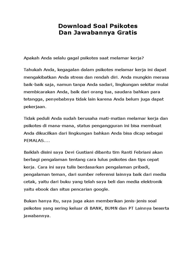 Kumpulan Contoh Soal Psikotes untuk Kamu yang Ingin Melamar Pekerjaan | IndoINT from sahabatnesia.com Inilah 5 contoh soal psikotes dan kunci jawabannya, dilengkapi kiat sukses menghadapi tes psikotes saat melamar kerja, dijamin sukses! Tips lulus tes matematika dasar untuk melamar kerja. Fase ini membuat banyak orang merasa perlu mencari cara agar lulus psikotes dan mendapatkan posisi yang diinginkannya. Dengan mempelajari papi kostick, maka kita akan banyak. Tujuan diadakannya tahapan ini adalah, untuk mengetahui kemampuan intelektual dari seorang pelamar kerja. Tes psikotes kerja dilaakukan saat seleksi masuk kerja di perusahaan, jika lulus maka kemungkinan besar akan diterima sebagai karyawan. Inilah sebabnya banyak yang belajar tes psikotes kerja untuk menjadi karyawan perusahaan bonafit. Info lowongan kerja terbaru 2020 informasi lowongan kerja tahun 2020 di bank bumn cpns migas kai telkom pertambangan cs teller untuk lulusan sma smk man d3 s1 s2 terbaru.